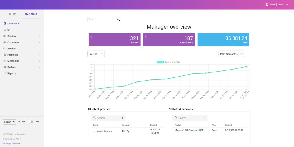The dashboard serves as the homepage for your catalog’s admin interface, offering a quick snapshot of vital business metrics and recent activity. Stay informed with up-to-date data and growth trends for key indicators of your subscription business, including the number of customer profiles, active services, and your Monthly Recurring Revenue (MRR).