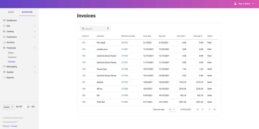 Gain a comprehensive overview of all your orders, quotes, agreements, and invoices within the Financials section. Easily browse and filter information by criteria such as profile, order number, reference number, date, invoice status, or type.