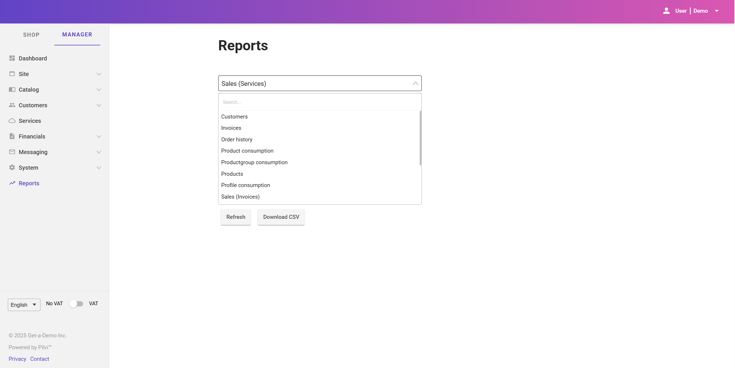 Monitor your online sales performance and results through our pre-built business reports and key metrics. Easily browse and filter data within your desired timeframe, broken down by product, customer, product category, or consumption. You can also import data in .csv format and export it to other business software.
