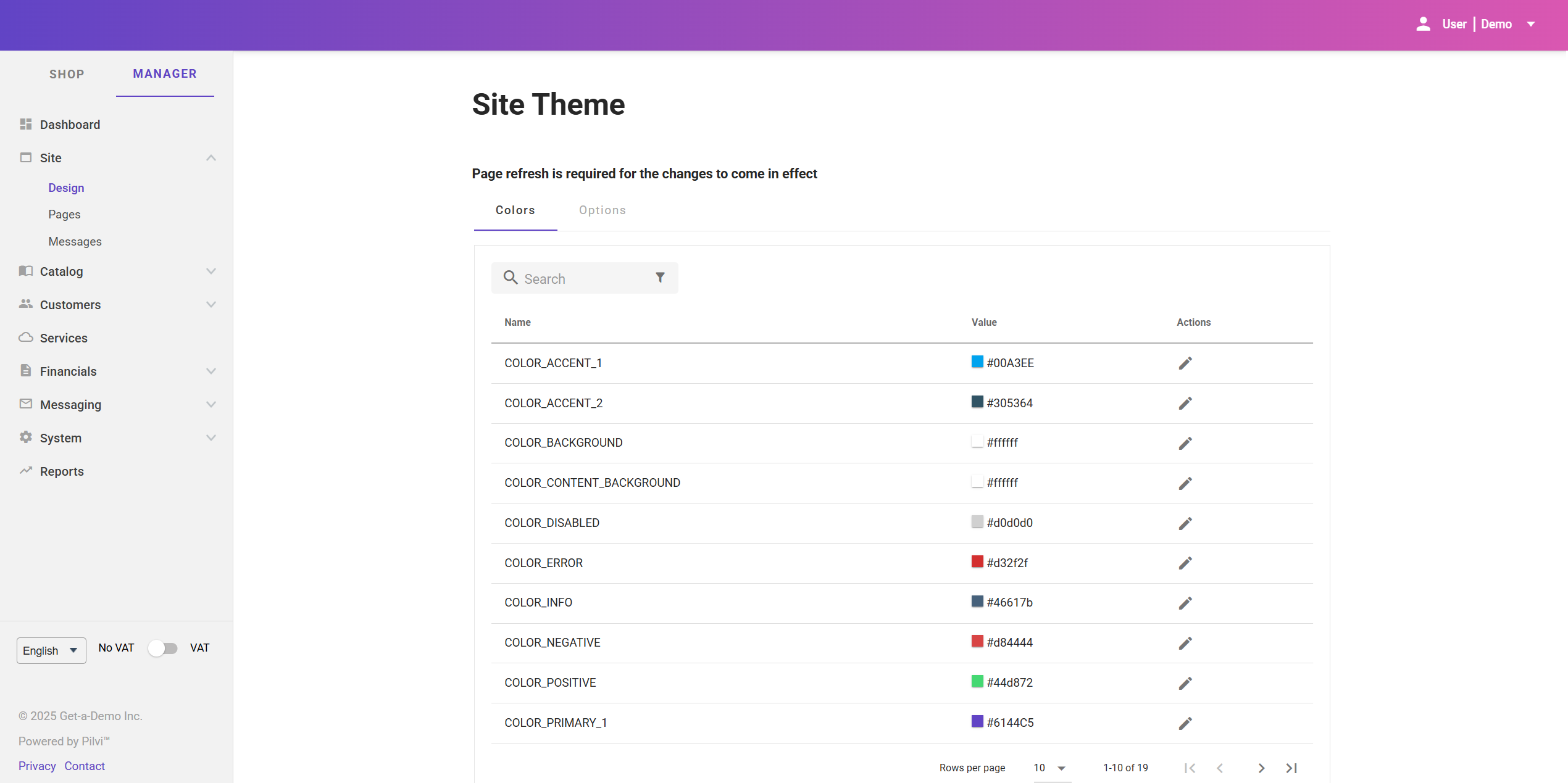 The Site section allows you to customize your catalog’s look and feel. You can define the your site’s elements and layout to align with your company’s branding and color scheme, modify various online pages and their content, and adjust the layouts and colors of your message templates and product listings.