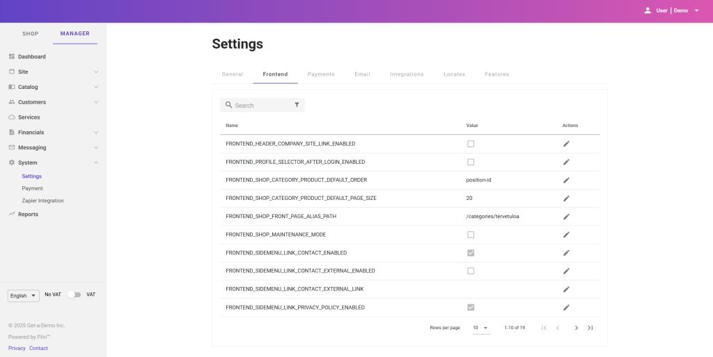 The System section contains your catalog’s system settings, configurations related to online visibility, customizations, and integrations. Define your company information and add your terms of service and privacy policy here. Connect your payment gateways and get ready to accept online payments.